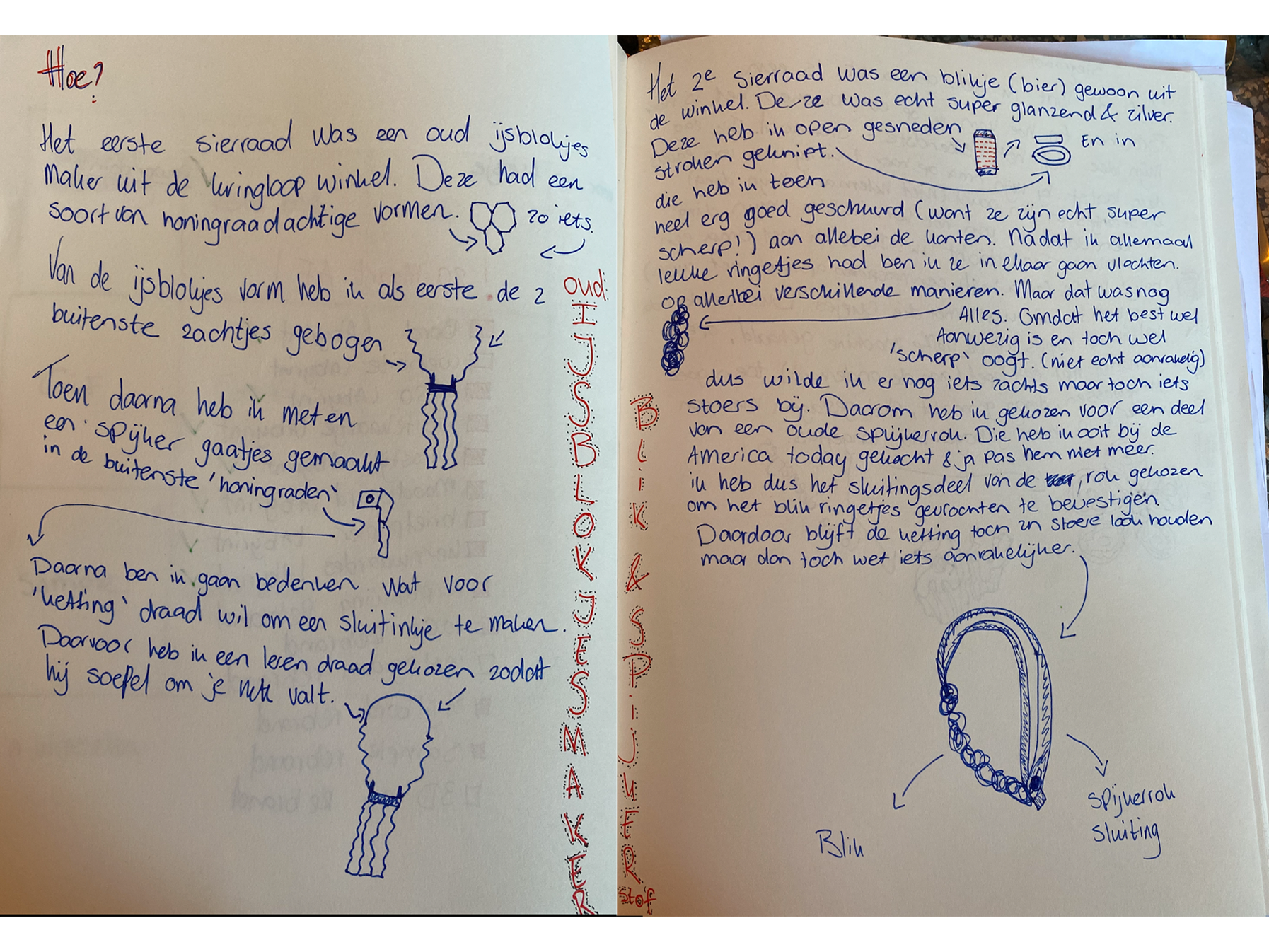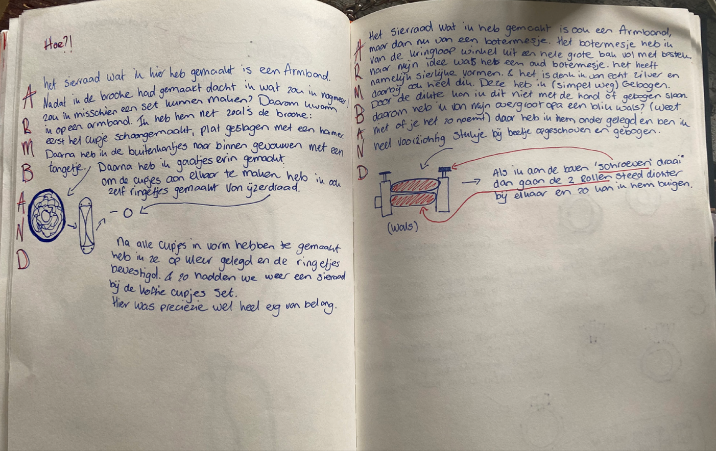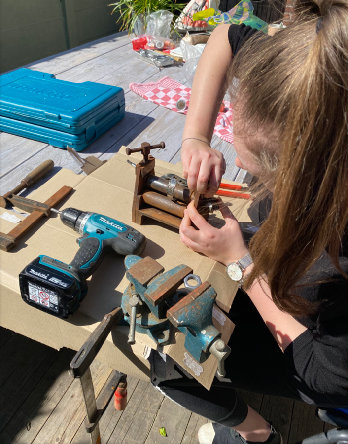 Ik bezocht verschillende kringloopwinkels, dook mijn vaders schuur in, in mijn kast, op de grond en om me heen. Om verschillende materialen, voorwerpen en producten te verzamelen om te gaan experimenteren hoe ik dit het beste kon hergebruiken en het dus een nieuw leven kon geven. ‘Gewoon doen en aan de slag gaan’. Zonder enige ervaring ging ik aan de slag met elk voorwerp op de manier waarbij ik dacht dat het beste zou zijn. Waarbij ik mezelf een soort methode heb aangehouden: het product Analyseren - het visueel maken doormiddel van Schetsen - Uitvoeren - Betekenis geven doormiddel van een verhaal. Zo ging ik aan de slag.