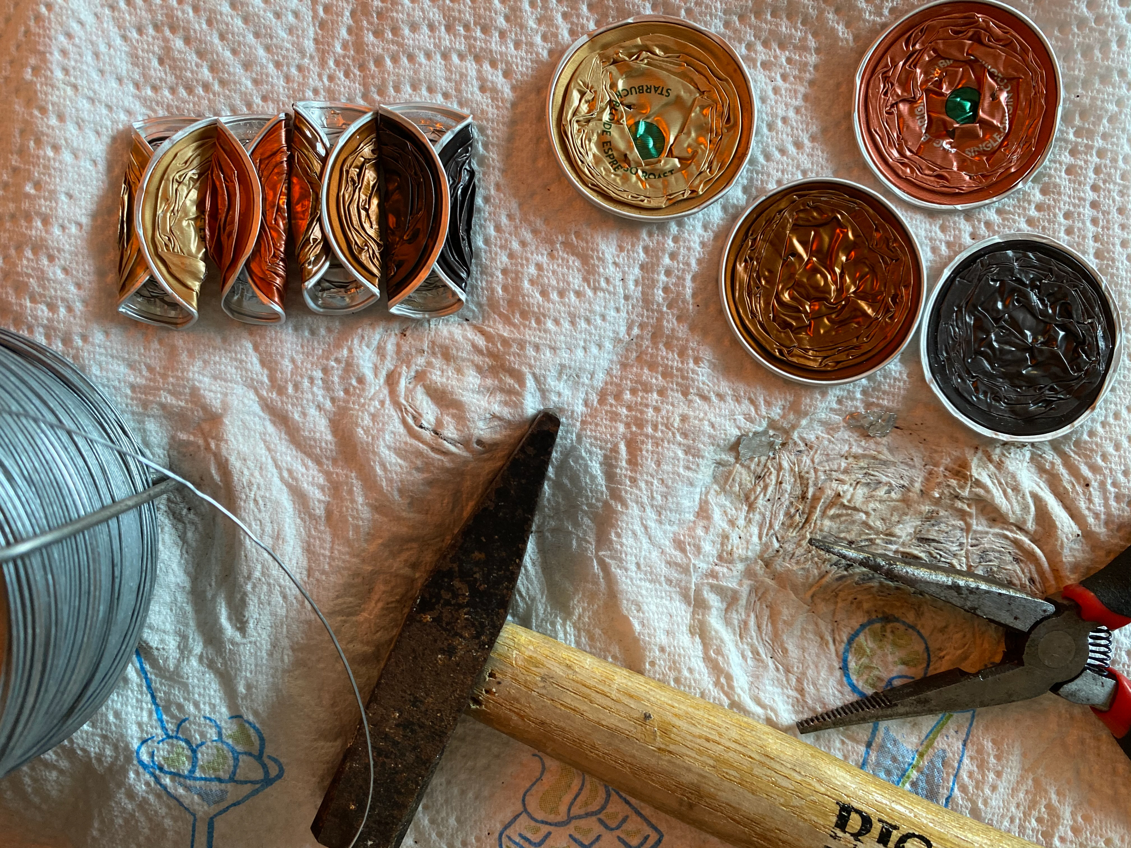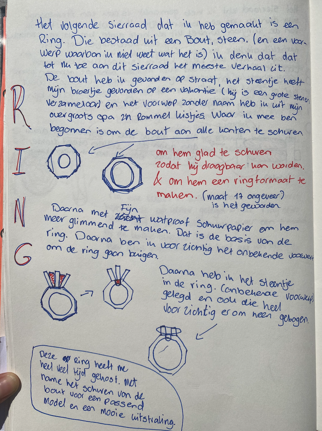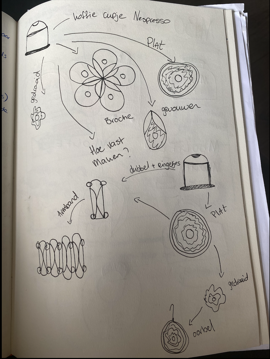 Ik bezocht verschillende kringloopwinkels, dook mijn vaders schuur in, in mijn kast, op de grond en om me heen. Om verschillende materialen, voorwerpen en producten te verzamelen om te gaan experimenteren hoe ik dit het beste kon hergebruiken en het dus een nieuw leven kon geven. ‘Gewoon doen en aan de slag gaan’. Zonder enige ervaring ging ik aan de slag met elk voorwerp op de manier waarbij ik dacht dat het beste zou zijn. Waarbij ik mezelf een soort methode heb aangehouden: het product Analyseren - het visueel maken doormiddel van Schetsen - Uitvoeren - Betekenis geven doormiddel van een verhaal. Zo ging ik aan de slag.